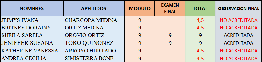 * Por la no aprobación del modulo el estudiante estará sujeto a las normativas del Centro de Formación Continua SERVSACAP